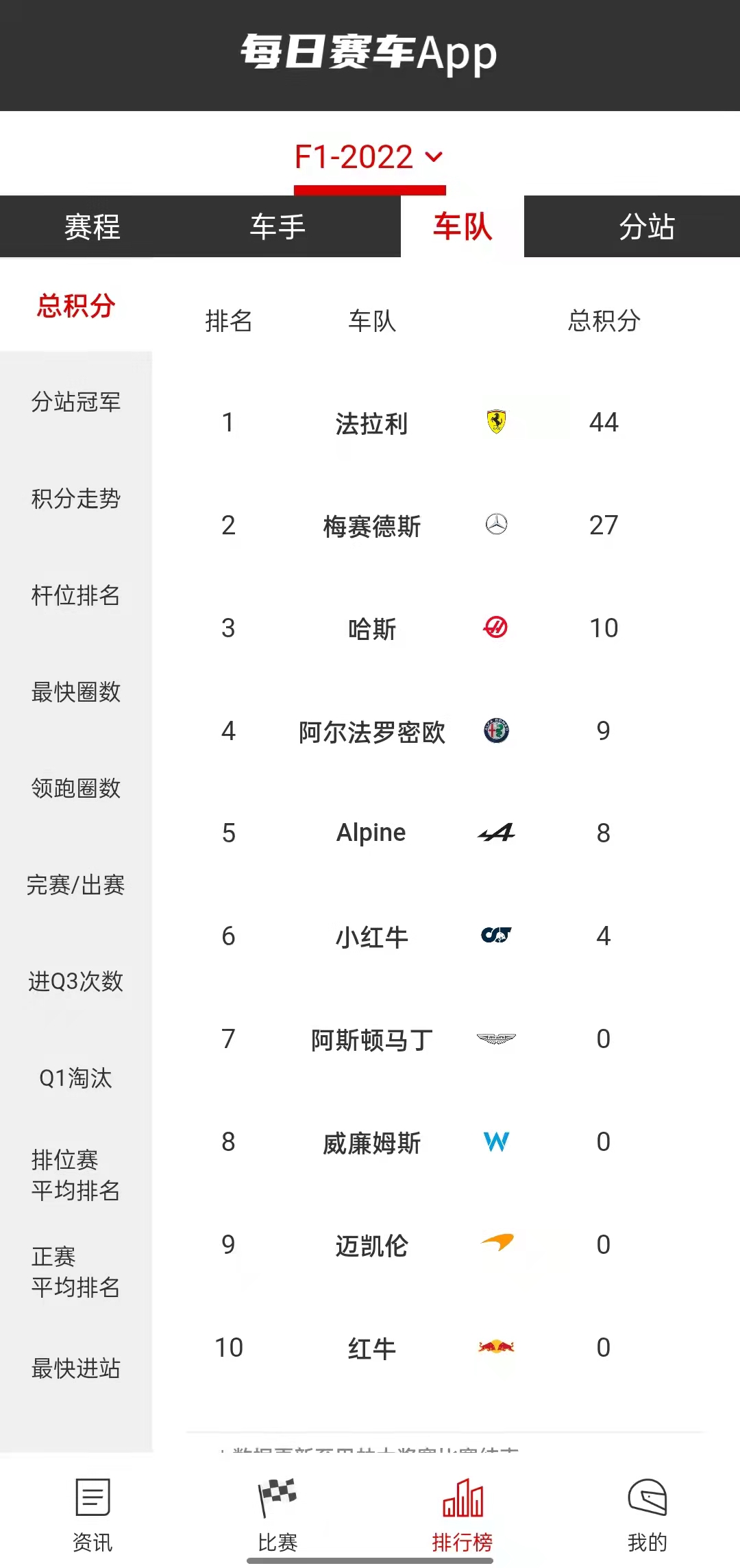 其中“车手”“车队”包括总积分,还有更多按照不同维度总结的排行。