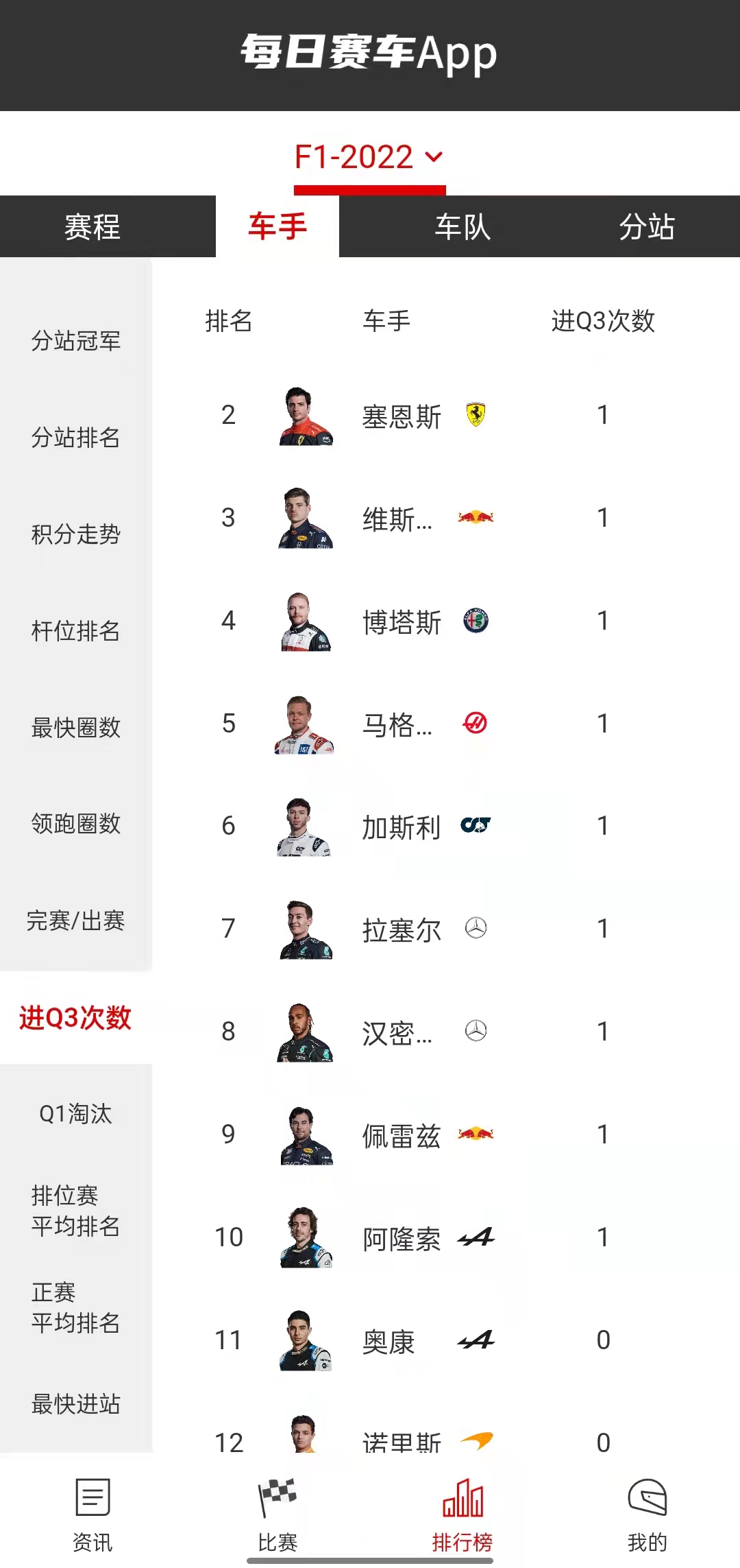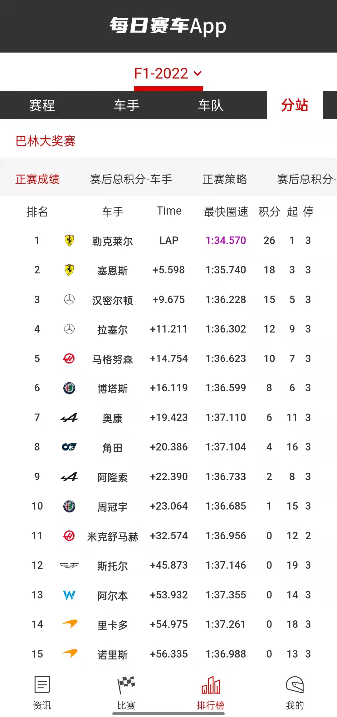 巴林站结束了亢奋的情绪之后,朋友可以点开APP最下端的“排行榜”,看看F1更多更详细的数据。