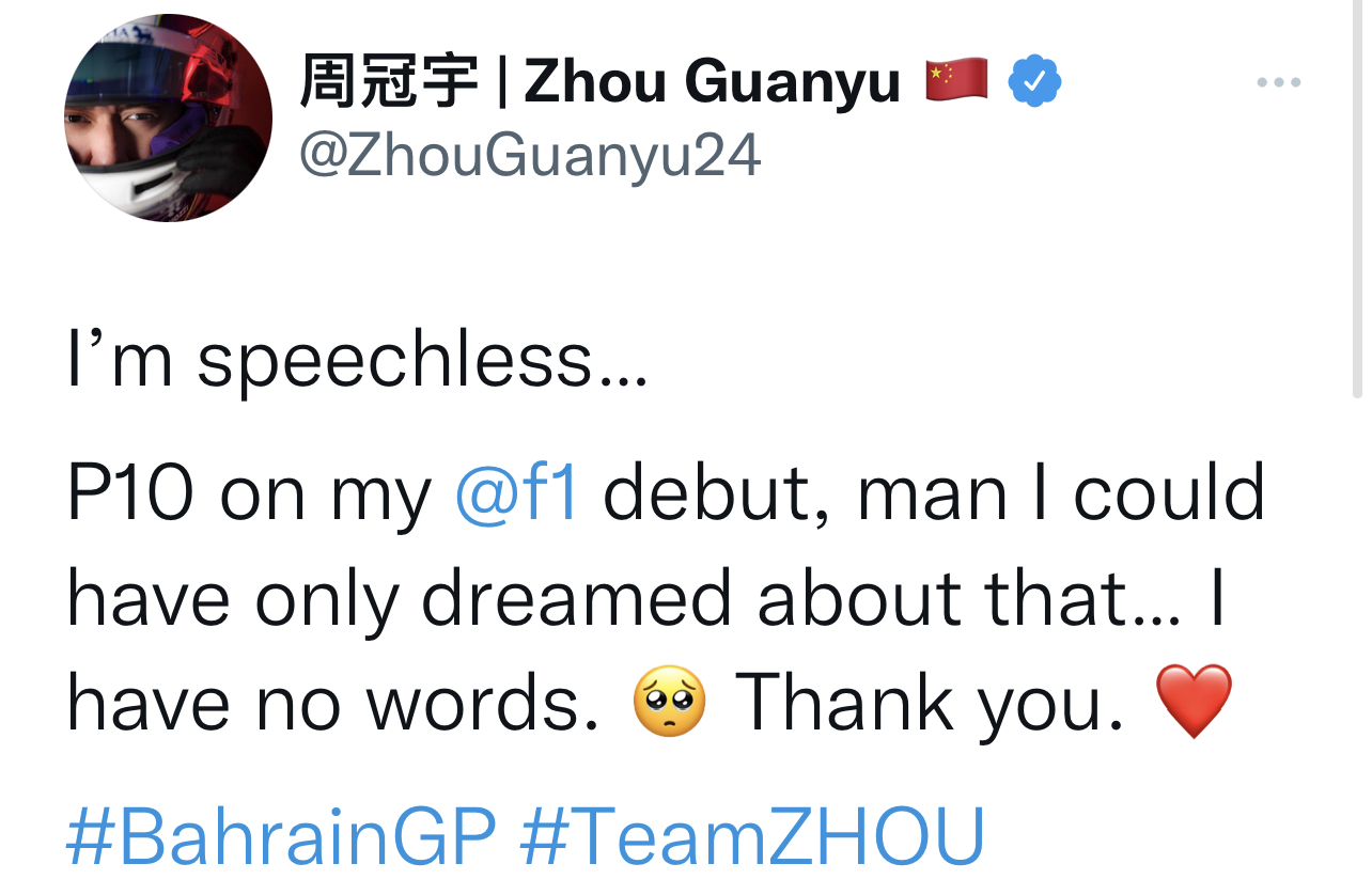 巴林站比赛后,周冠宇在社交媒体连更两条动态。