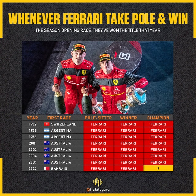 法拉利拿到揭幕赛杆位+冠军的赛季,都赢了车手总冠军!