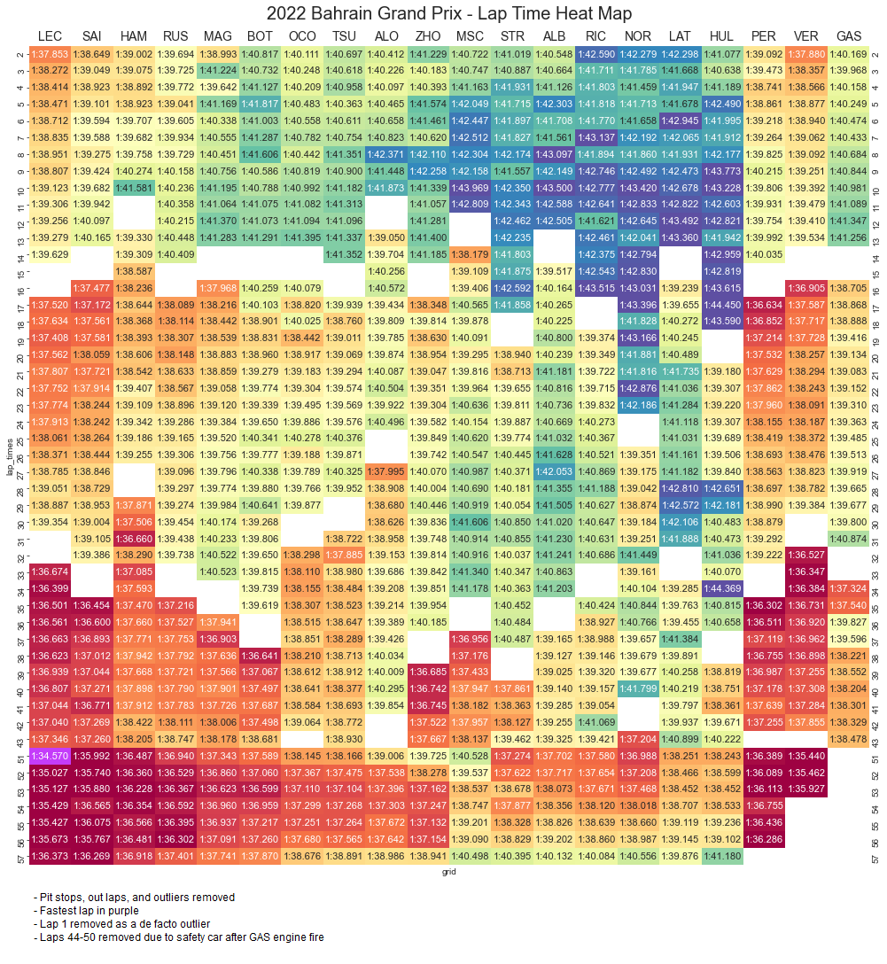 有网友制作了F1 2022巴林站的圈速热力图。越接近深红色表示圈速越快,越接近深蓝色表示圈速越慢。最快圈是勒克莱尔在第51圈做出的1分34秒570(紫色)。第一圈、进站圈和安全车圈都已经被剔除。