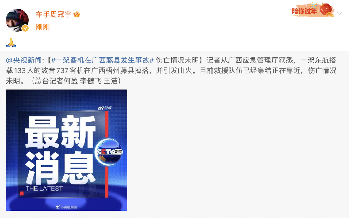 东航客机出现事故,周冠宇祈福🙏