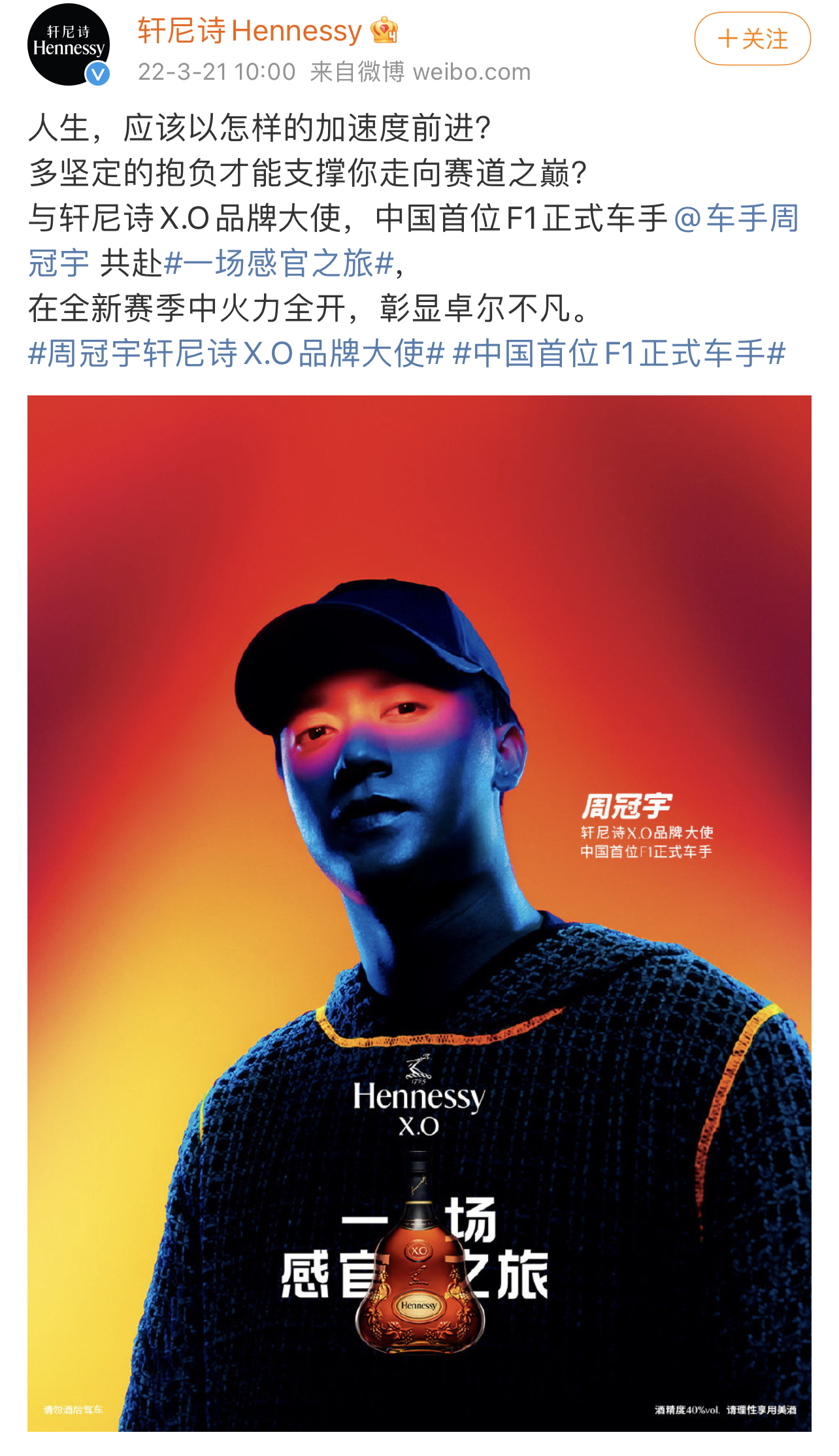 轩尼诗X.O官宣,中国F1车手周冠宇将担任品牌大使。