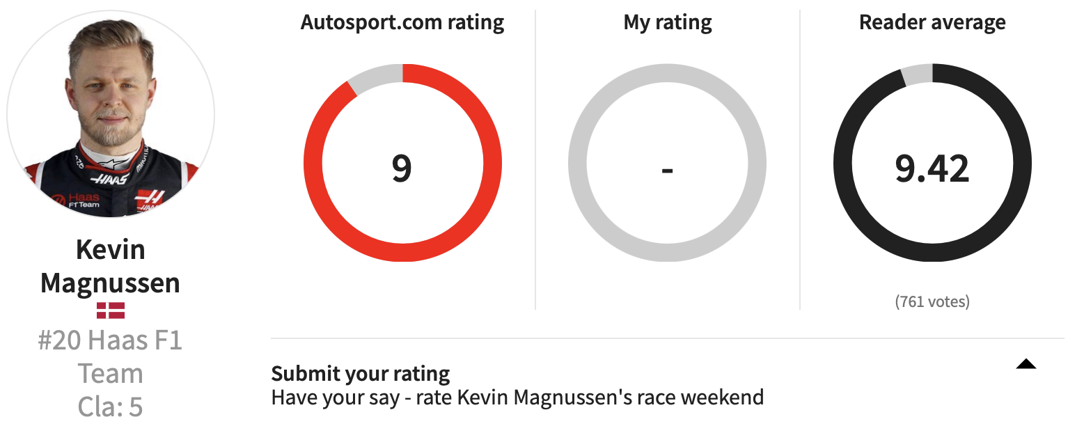 虽然比队友马格努森测试的时间多,但表现出的经验不足依旧让人感到疑惑。正赛最后阶段,由于轮胎劣势被阿隆索和周冠宇超越。