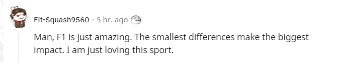 @Fit-Squash9560:兄弟,F1太神奇了,这么一点区别有这么大的影响。我太爱这项运动了。