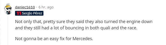 @daniec1610:不止如此,我很确定他们把引擎输出的功率调低了,但他们在排位和正赛还是有很多弹跳。这对于梅赛德斯不会是个简单的问题。