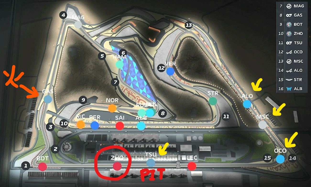 周冠宇身后呢,有正在换轮胎的维修区里的角田,已经到了大直道起点的奥康、米克舒马赫和阿隆索。
