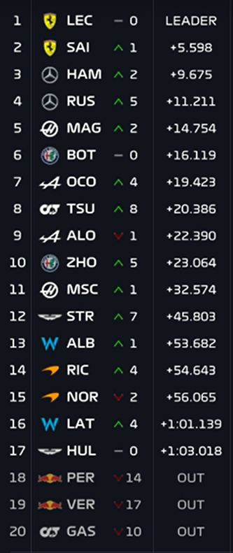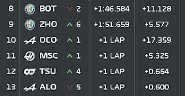 我们看到在阿尔法罗密欧双车进站前,博塔斯领先周冠宇5秒,周冠宇离后车奥康是17秒,米克22秒,角田23秒,阿隆索24秒。