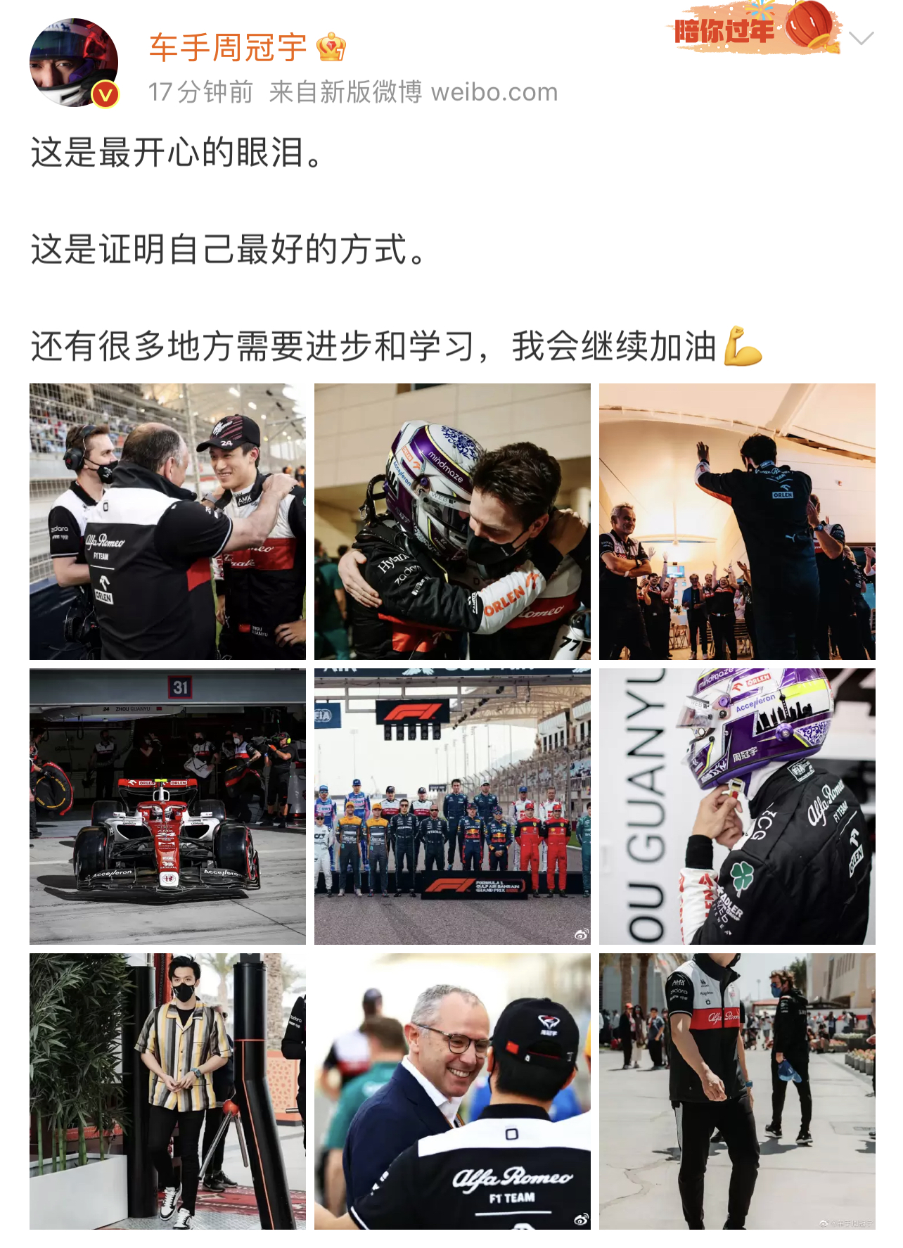 周冠宇更新微博:这是最开心的眼泪,我证明了自己