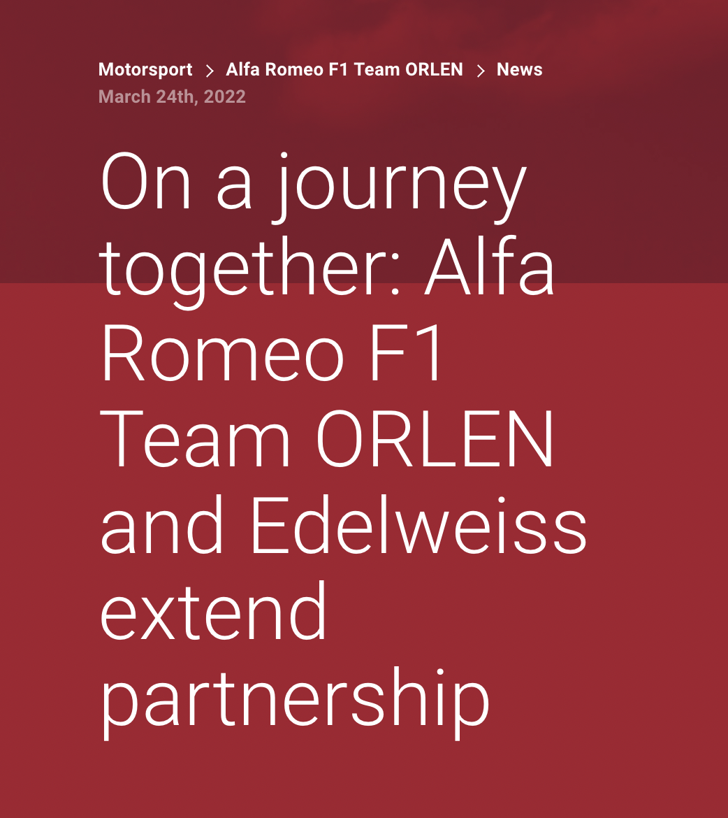 阿尔法罗密欧在官网官宣,与瑞士雪绒花航空续约。该航空公司将负责车队的旅行。同时,雪绒花航空的标志也会出现在博塔斯和周冠宇的赛车上。
