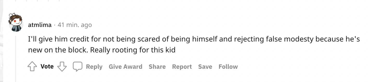 最后,有网友发言道:“他没有因为自己是新来的,就害怕做自己,并且能对虚假的谦逊说不,我很欣赏这一点。真心支持这孩子!”