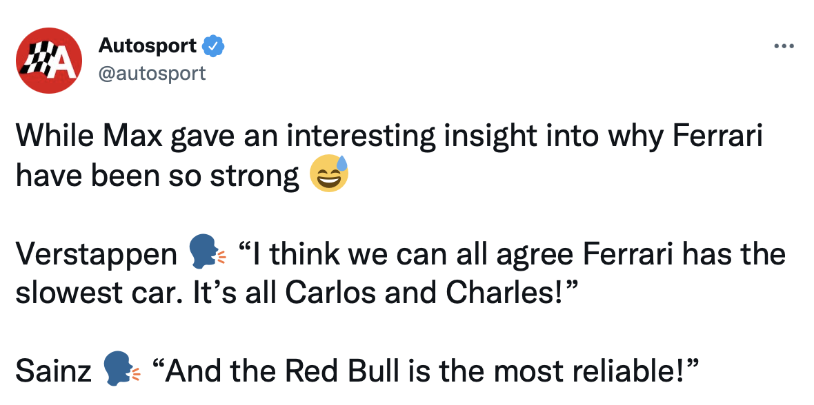 发布会上,当维斯塔潘被问到法拉利为何很强时,维斯塔潘说:“我认为大家都知道法拉利是最慢的车,因此都是塞恩斯和勒克莱尔的功劳。”