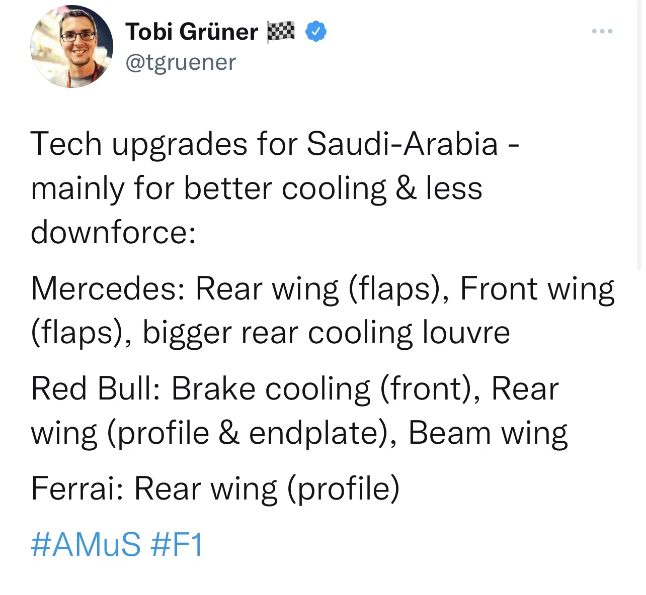 根据AMuS的消息,梅赛德斯、红牛和法拉利在沙特都对赛车进行了升级,主要目的是改善散热和减小下压力。车队主要在一下几个部分做了改动: