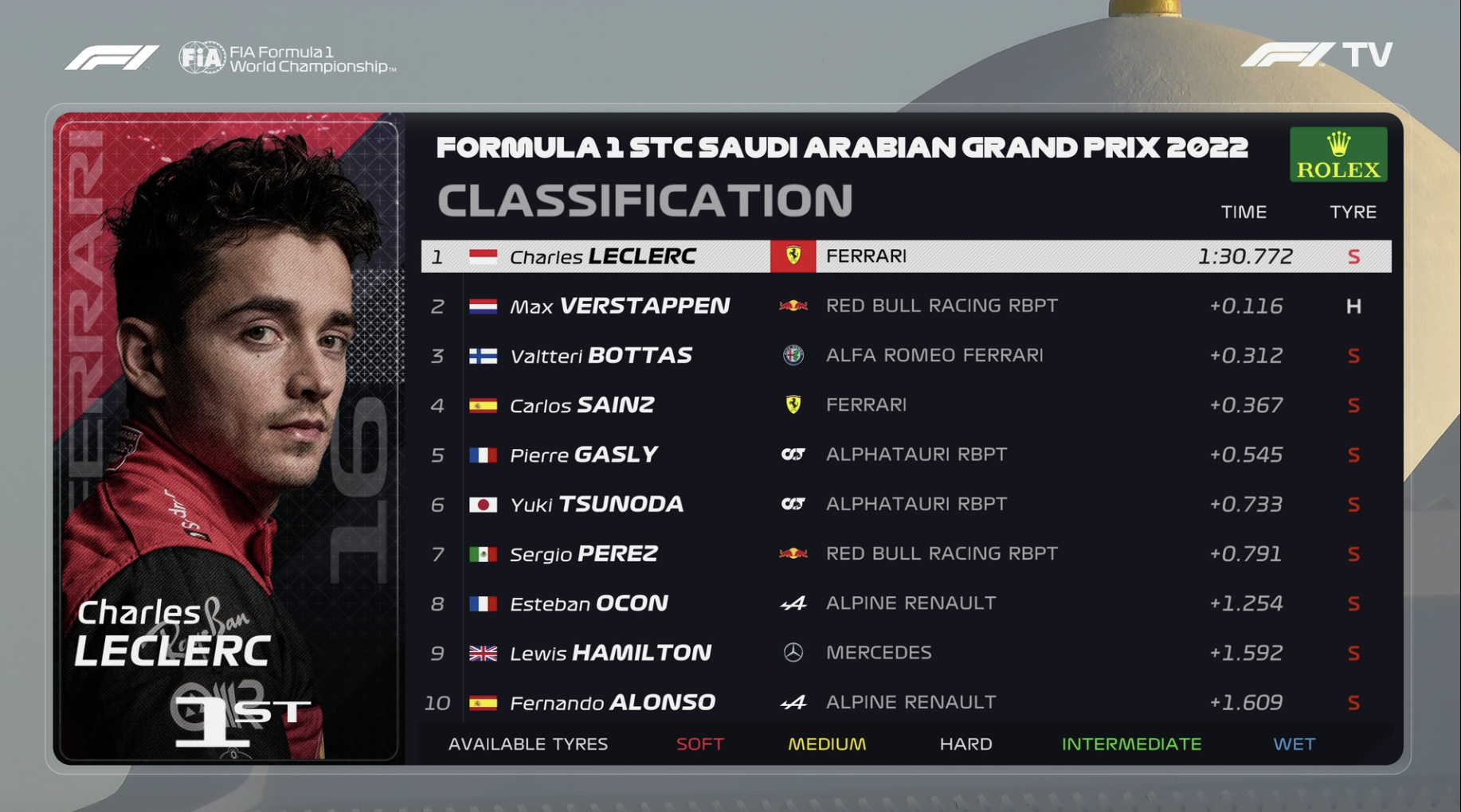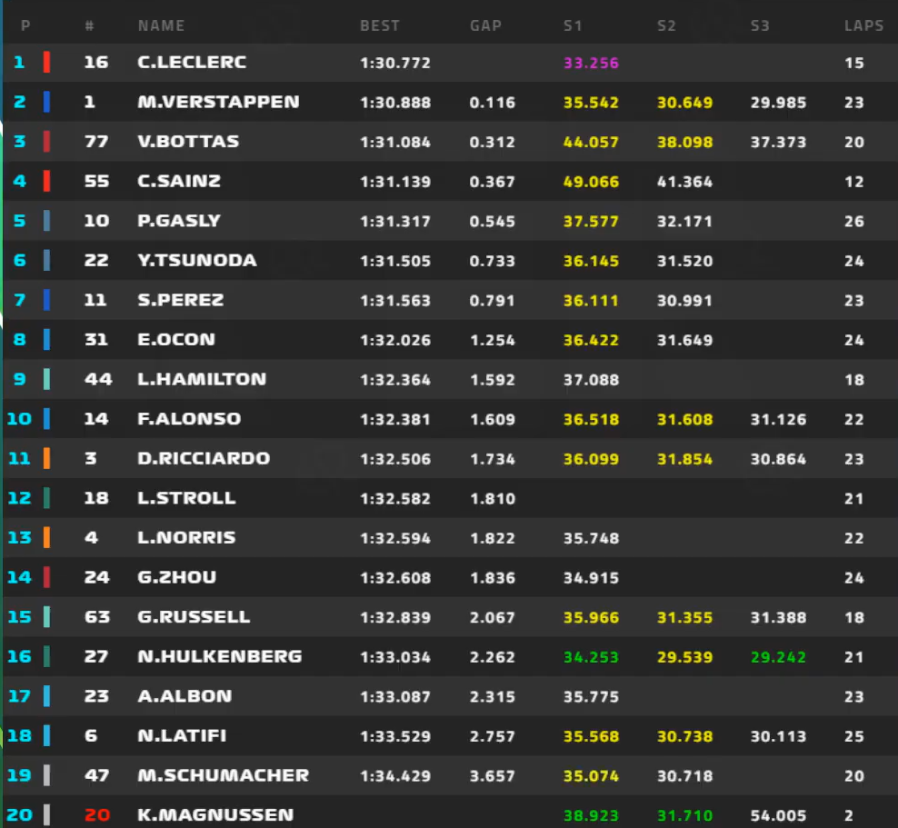 最后10分钟,车手们再次出场,勒克莱尔以1:30.772的成绩刷到第1,博塔斯也成功上到第3位。
