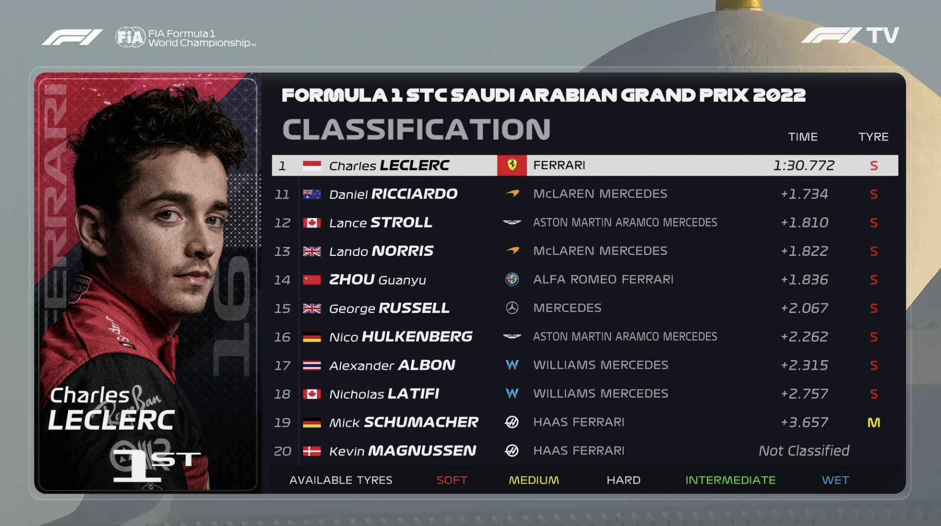 比赛结束,最终勒克莱尔排名第1,维斯塔潘依旧以之前的成绩排在第2,博塔斯排在第3,周冠宇也成功攀升至14名。