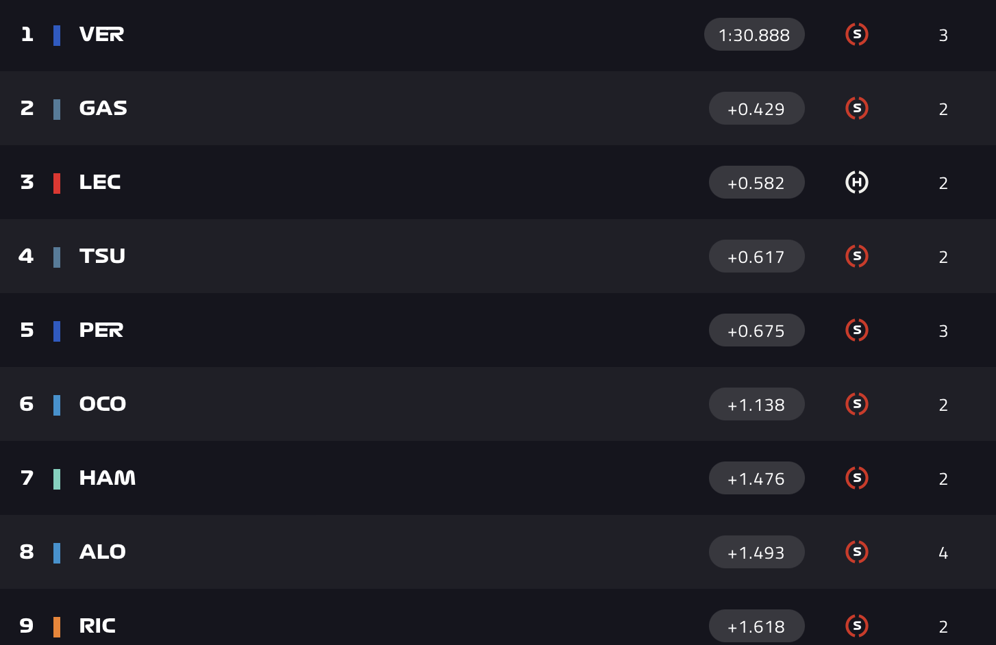 比赛还剩15分钟时,维斯塔潘排在第一,加斯利和勒克莱尔排名二三,周冠宇第19名。