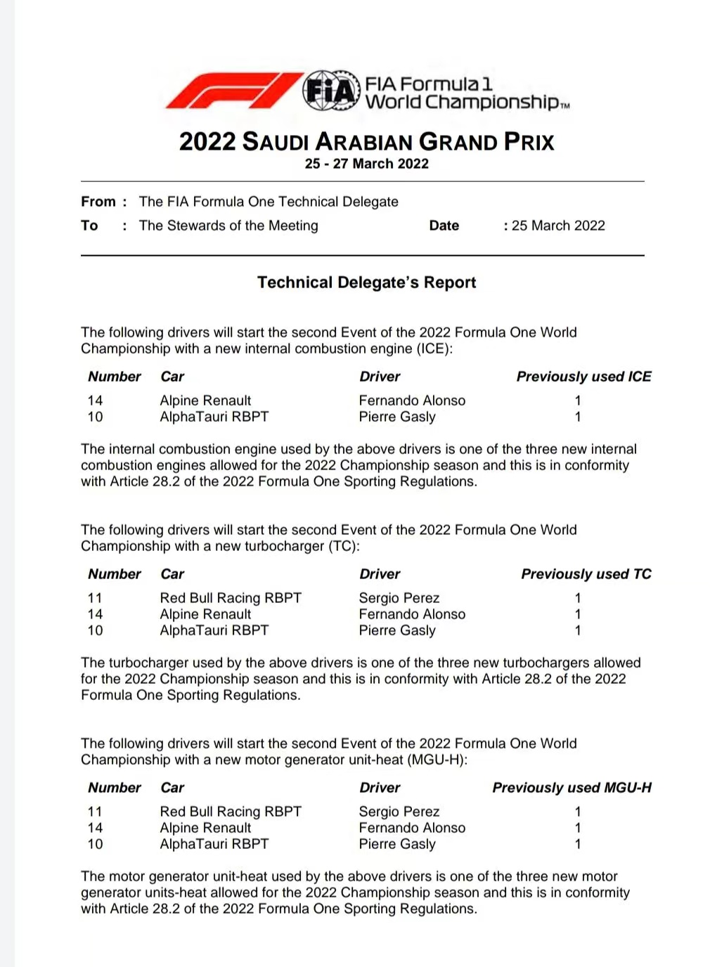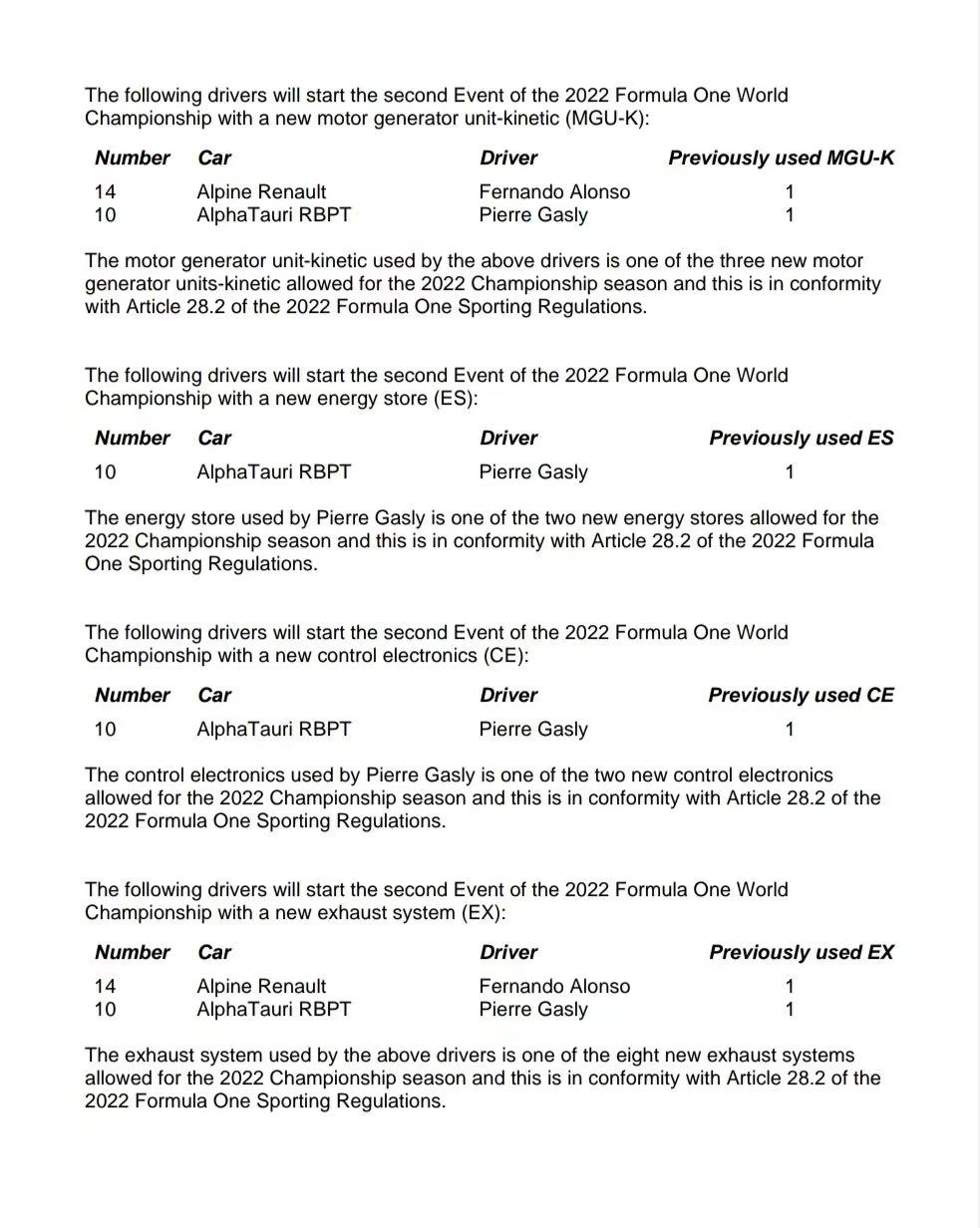 根据FIA的官方文件,加斯利在上一站起火后,更换了整个动力单元,阿隆索因为密封问题更换了除动力存储单元(ES),电子控制单元(CE)以外的所有动力单元零件,佩雷兹更换了涡轮增压(TC)和MGU-H。