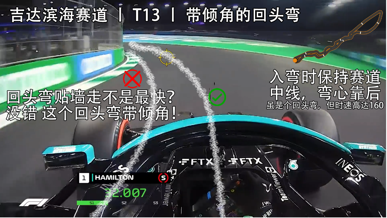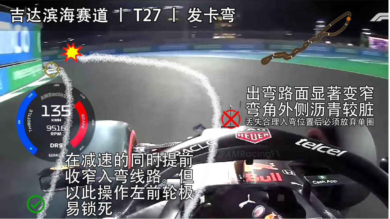 吉达赛道的第三段几乎全部是以高速弯构成,而T27发卡弯是唯一的例外。与T13截然不同,这是一个标准的慢速回头弯,赛道宽度也在这里发生着悄然的变化。当车手们持续地完成高速转向和直线加速后,轮胎已临近衰竭,刹车温度也濒临临界。此时车手们踩下一脚重刹,同时面临着心理和车辆性能的双重考验。2021赛季维斯塔潘的飞驰圈就在此处功亏一篑,原因就是他没能在入弯前有效减速而偏离了理想路线。心理因素同时在作祟,年轻的荷兰人并不想就此放弃争夺杆位的机会,但此时赛车已经位于赛道的脏侧。最终他丢失了对赛车的控制,后轮撞墙而抱憾退出。