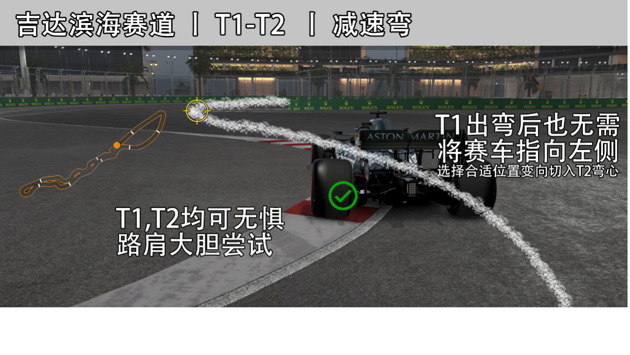 这条赛道第一计时段就有着堪比蒙扎一整圈的弯角数量,T1,T2又是这一计时段连续S弯设计中最慢的一个。由于整体速度下降到100公里每小时,因此车手们都将大胆地把单侧轮胎骑上这并不平缓的路肩。这两个弯角弯心处虽窄,但T2出弯后似喇叭口的设计给予车手较为宽广的沥青路面以供加速,因此车手们并不会在T1出弯后过于贴向赛道左侧,而是直接选择以一个较小的角度精准切入T2弯心,以待取得最好的出弯开油点。