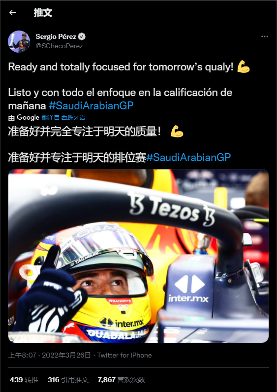 在结束长达四小时的车手会议后,佩雷兹率先更新个人社交媒体,表示将全力准备明天的排位赛。