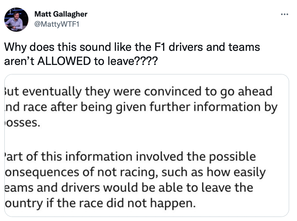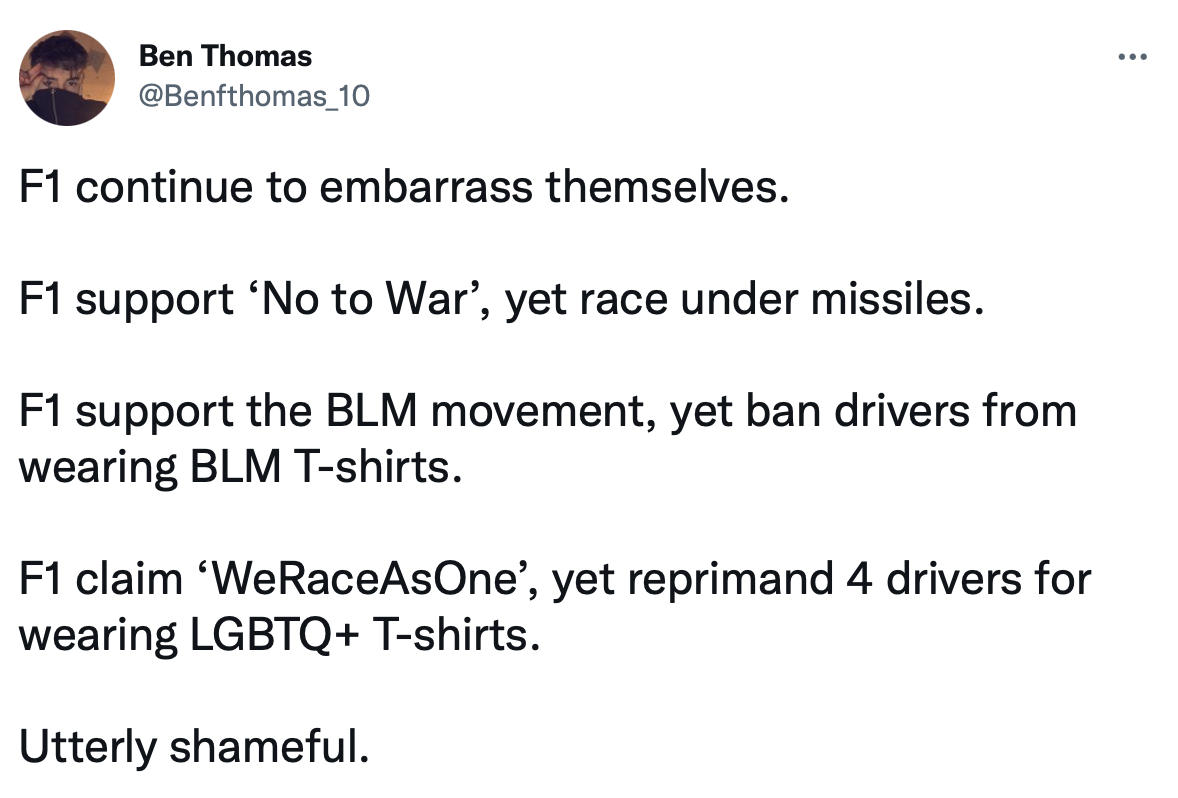 F1支持“No to War”,但允许在导弹袭击下继续比赛;