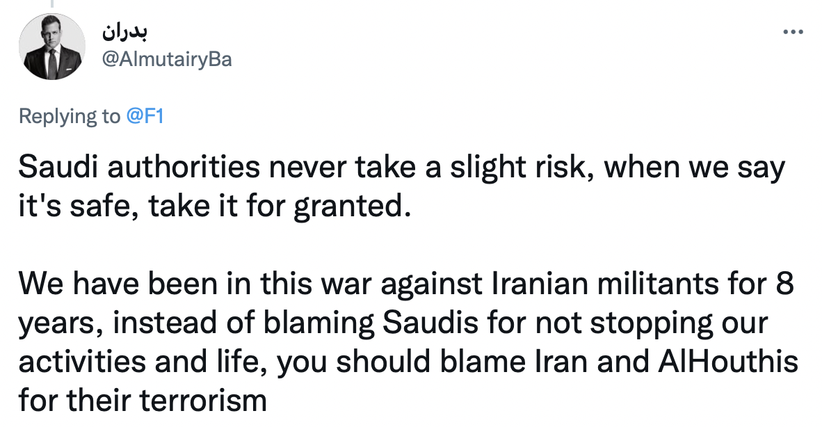 “沙特当局从不冒险,当我们说情况是安全时,我们可以打保票。我们已经与伊朗打了八年,与其谴责沙特不终止比赛,大家其实应该谴责伊朗和胡塞武装的暴行。”