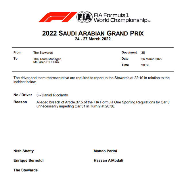里卡多将因为在9号弯阻挡奥康向赛会干事汇报。除此之外,他和马格努森、阿尔本还会因为维修区中的不安全释放事故被赛会召唤。