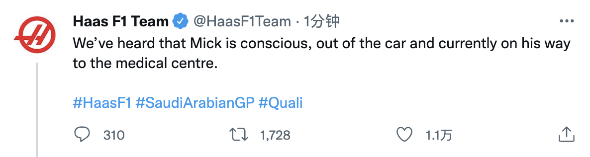 米克·舒马赫意识清醒,已被送往医疗中心。