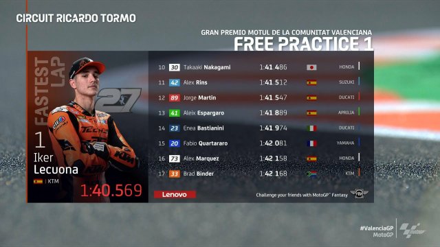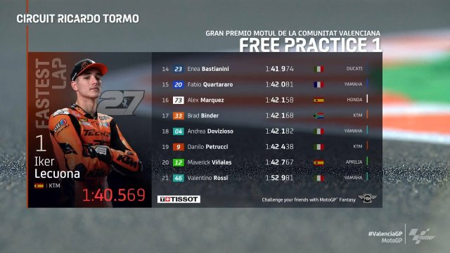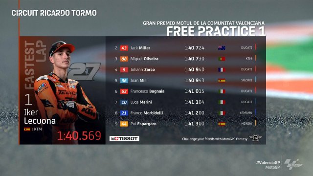 在刚刚结束的MotoGP瓦伦西亚站第一次练习赛中,KTM表现亮眼,Tech 3 车队的伊克尔·勒库纳在湿地条件下取得全场最快,单圈成绩为1:40.724。杜卡迪厂队的米勒排名第二,KTM厂队的奥利维拉排名第三,两人均落后不到0.2秒。
