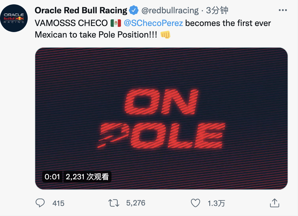 红牛发推庆祝:佩雷兹是第一个拿到杆位的墨西哥车手!