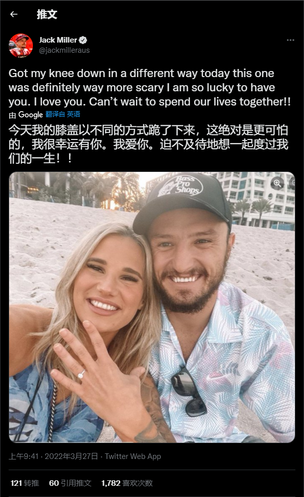 3月27日,现役MotoGP车手Jack Miller更新推特,表示和女友求婚成功。