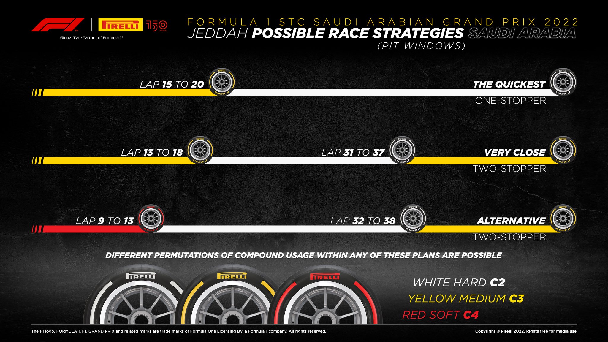 倍耐力给出了沙特站正赛轮胎策略,15至20圈时黄换白的一停被认为是最快的策略,其次是黄-白-黄的策略,官方预测第三快的策略是红-白-黄。