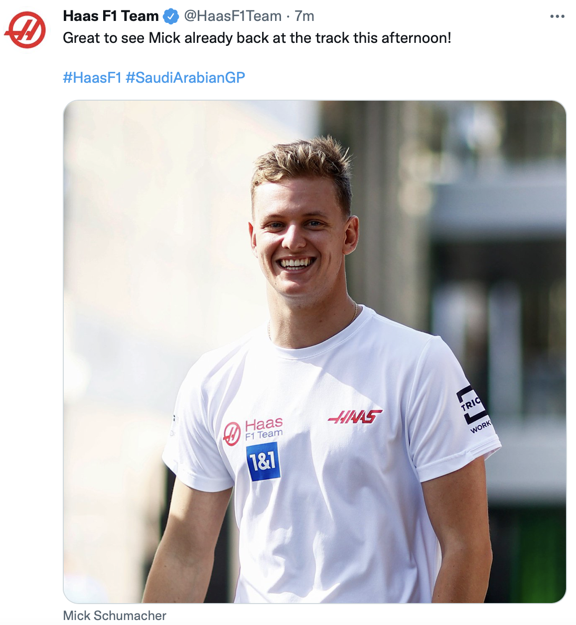 哈斯车队在社交媒体发文称,很高兴看到米克重回围场。