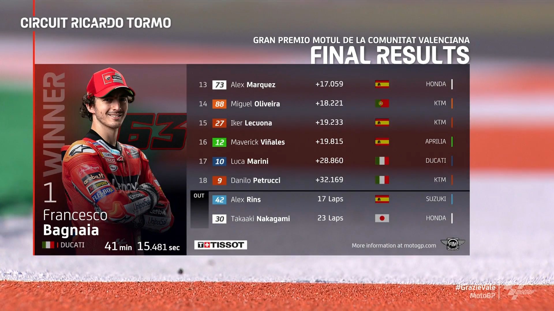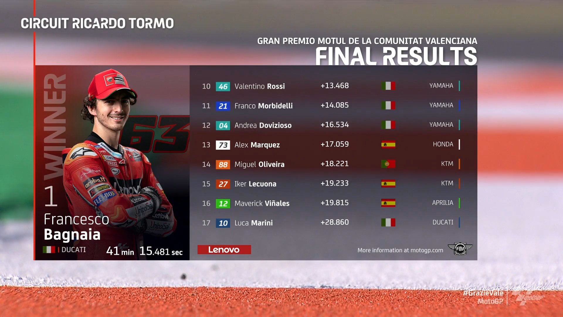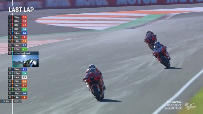 在刚刚结束的MotoGP瓦伦西亚站正赛中,杜卡迪车手弗朗切斯科·巴尼亚亚率先冲过终点线,连续两场比赛夺冠。Pramac车手马丁取得亚军,米勒收获季军,杜卡迪赛车成功包揽前三。瓦伦蒂诺·罗西在自己MotoGP生涯的最后一场比赛中取得第10,传奇完美谢幕。