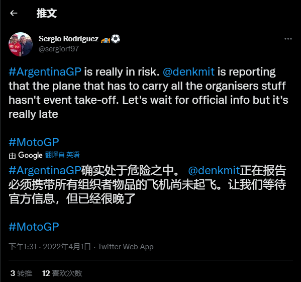 据西班牙记者Sergio Rodríguez推特,本周末的MotoGP阿根廷站的比赛或危在旦夕,因为货运飞机还没有起飞。