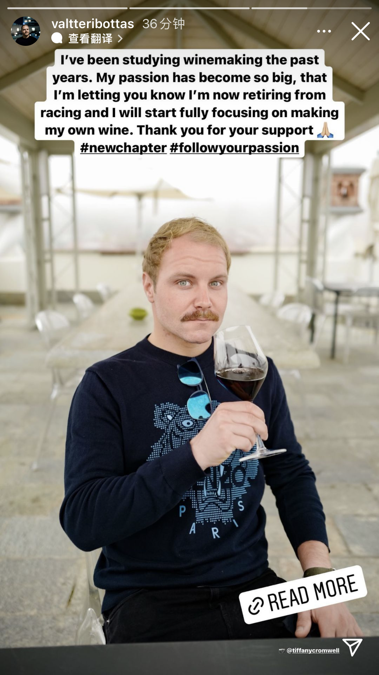 博塔斯在Ins上写道:“我在过去几年一直在学习红酒制作。我真的太爱造酒了,我要告知大家,我退役不跑比赛,要完全专注于制造自己的红酒了。谢谢大家的支持。#新篇章 #追寻热爱”