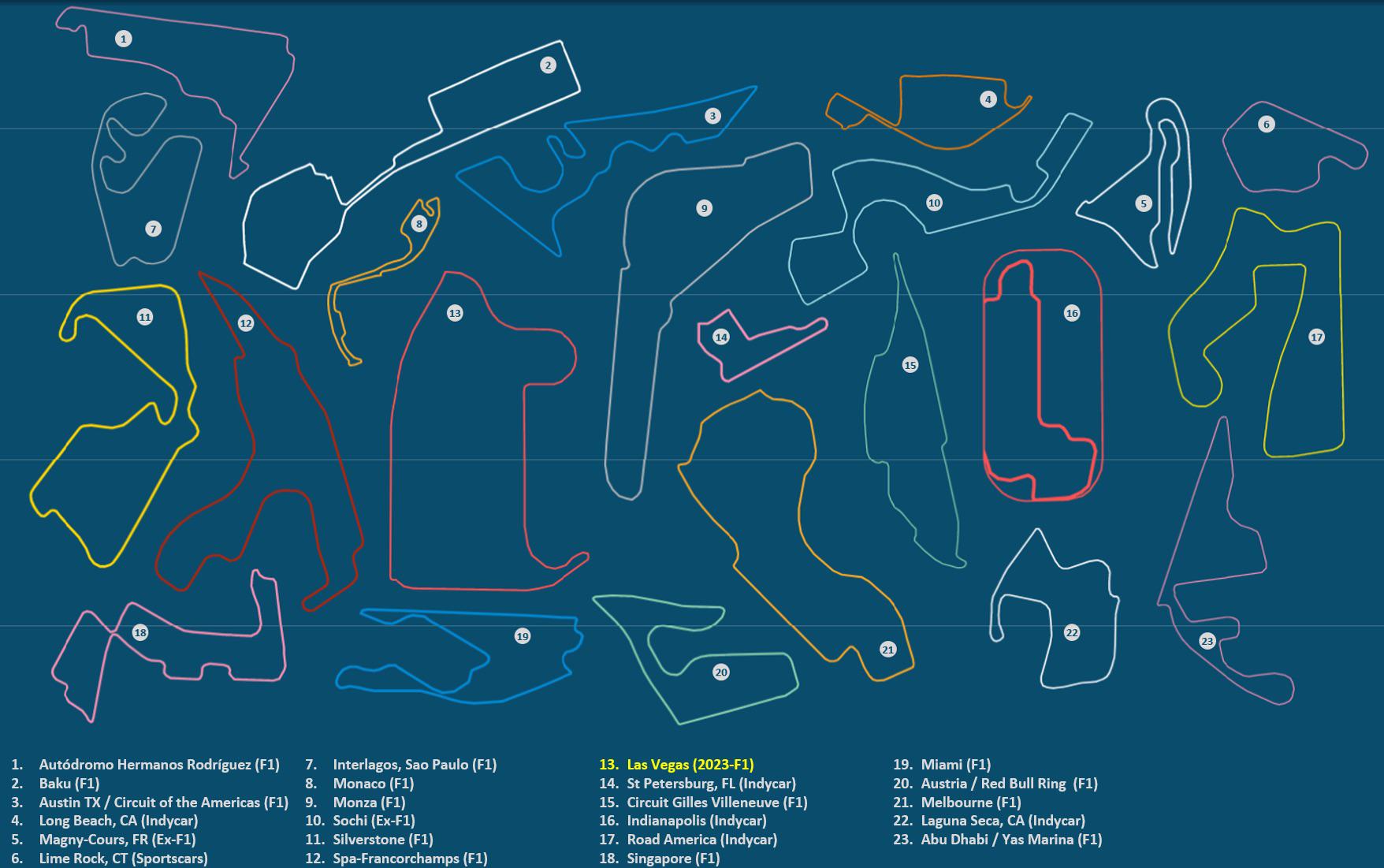 Reddit网友制作一张拉斯维加斯赛道与其它赛道的对比图,图中赛道的大小基本反映了各条赛道的实际长度关系。
