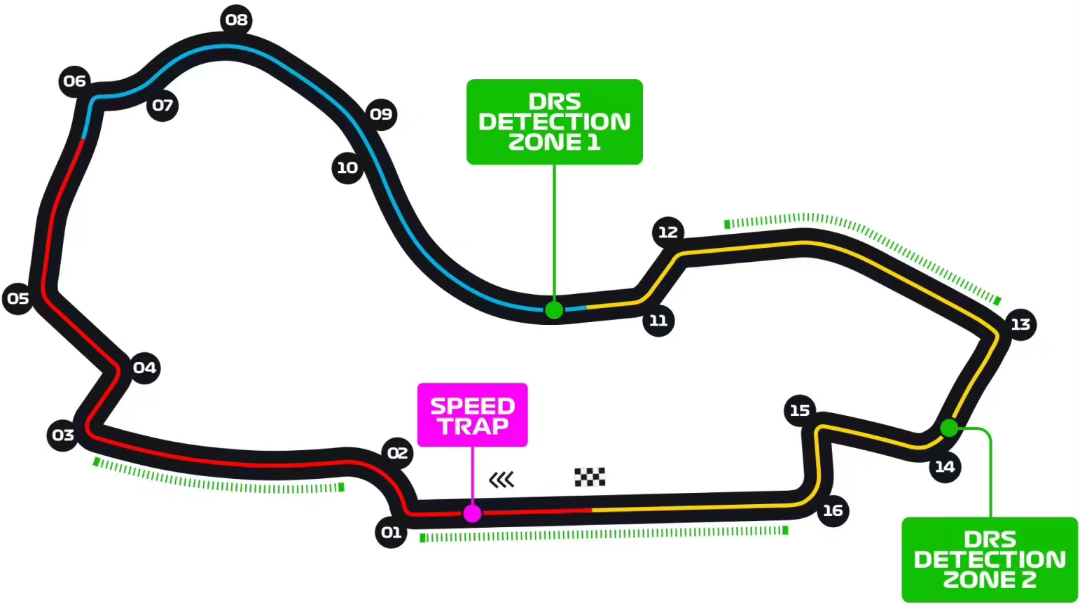 旧的9号、10号弯合并,改为全油门布局。该部分的平均速度预计将超过330km/h,车手在入弯时受到的重力加速度约为5.4G。过弯后的直道会成为新的DRS区域。