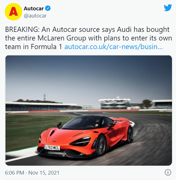 据英国汽车媒体Autocar消息,奥迪已完成对迈凯伦集团的全资购入,准备正式进军F1。