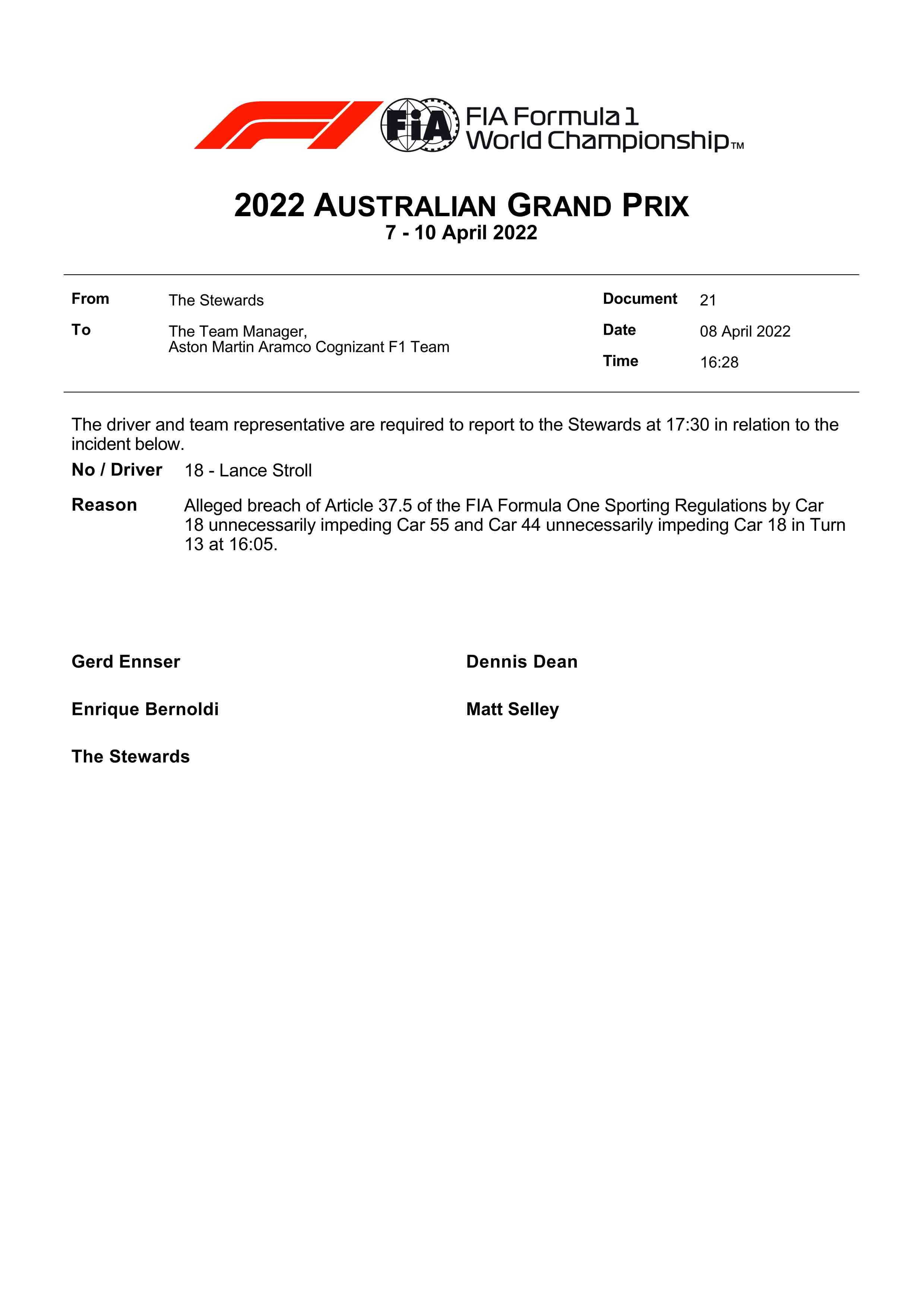 FIA发出文件,斯托尔由于在非必要状态下阻挡塞恩斯,被赛会干事传唤。此外,文件中还报告了汉密尔顿阻挡斯托尔一事。