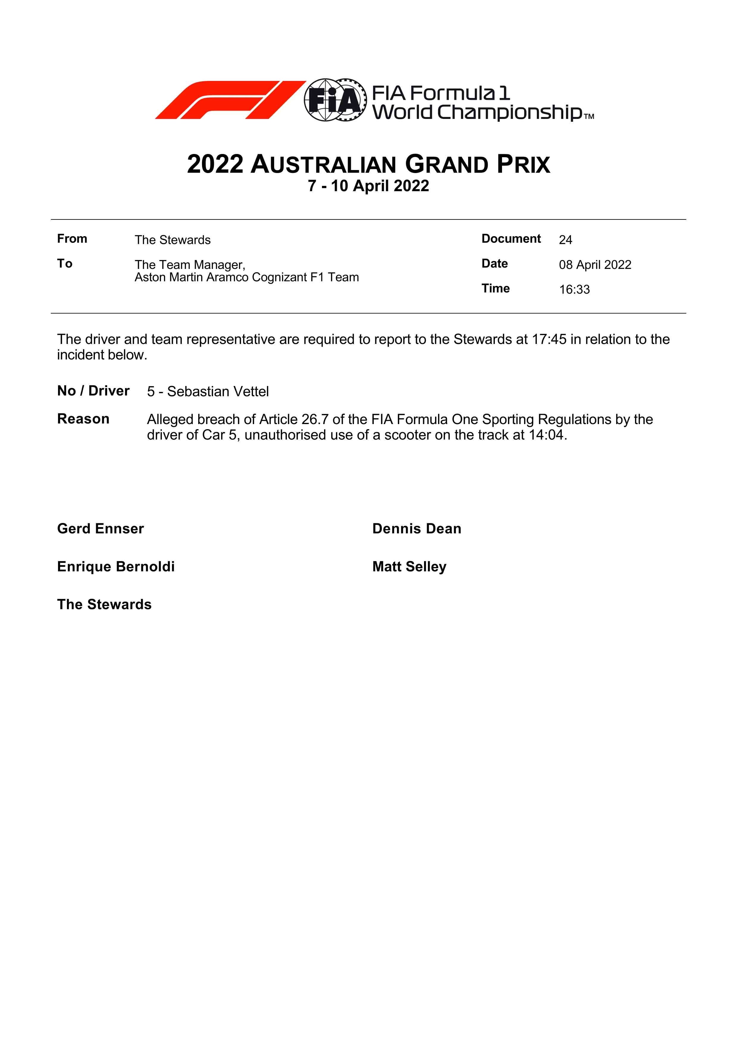 FIA发出文件,由于维特尔在一练期间,没经过允许就将摩托车驶上赛道,被赛会干事传唤。