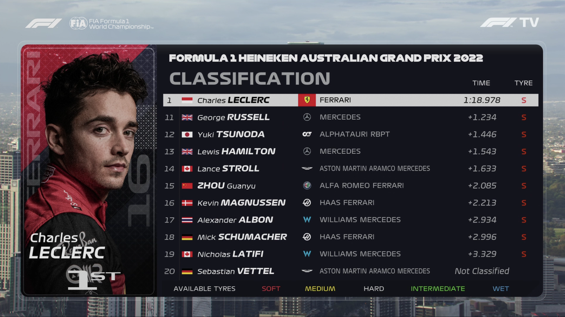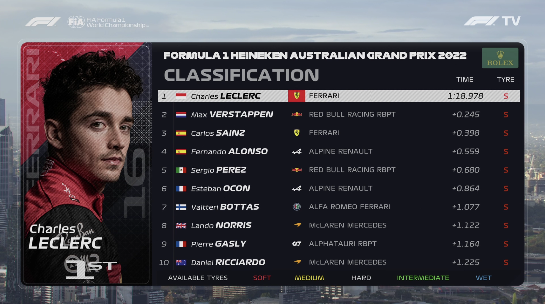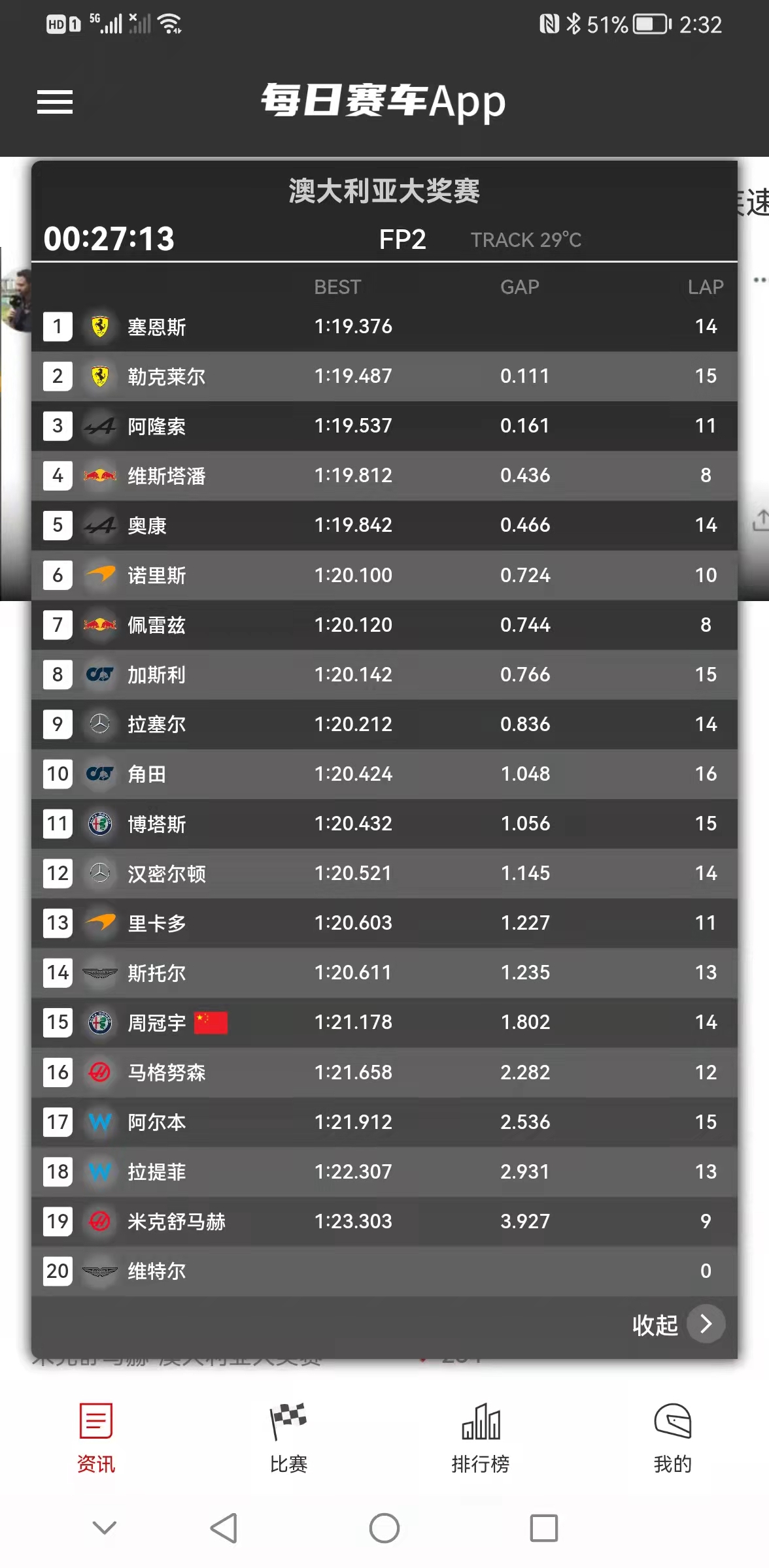 澳大利亚站FP2结束,勒克莱尔1:18.978排名第一,维斯塔潘1:19.223排名第二,塞恩斯1:19.776排名第三,周冠宇1:21.063排名第十五,博塔斯1:20.055排名第七,汉密尔顿1:20.521排名第十三。以上成绩均使用软胎做出。