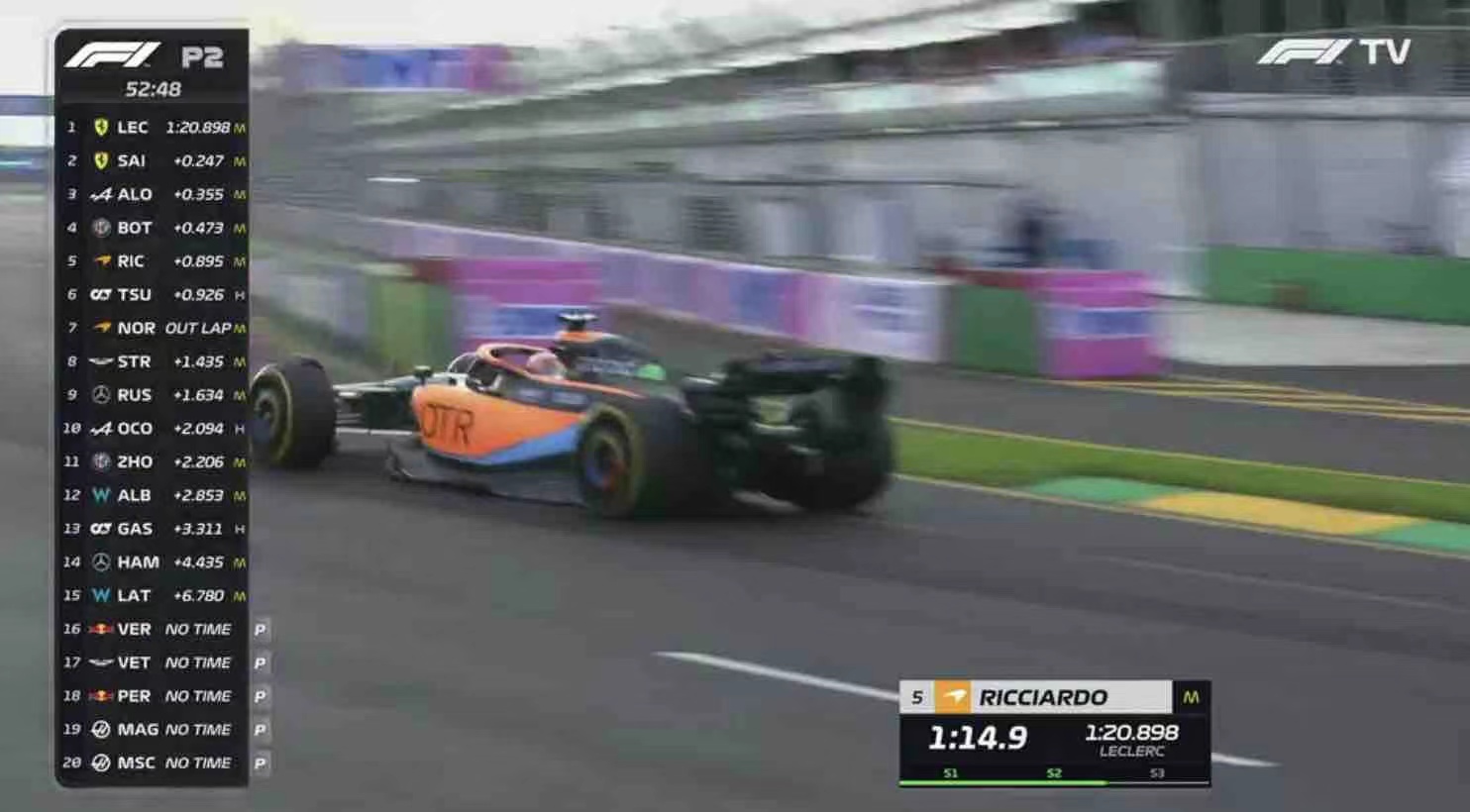第四分钟,里卡多率先使用中性胎做出1:20.603上到第一,队友诺里斯紧随其后。