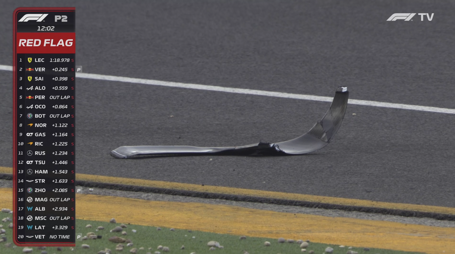 随后比赛恢复,FP2还剩9分钟。各个车队基本都换回中性胎,进行最后的测试。最快成绩未发生变化。