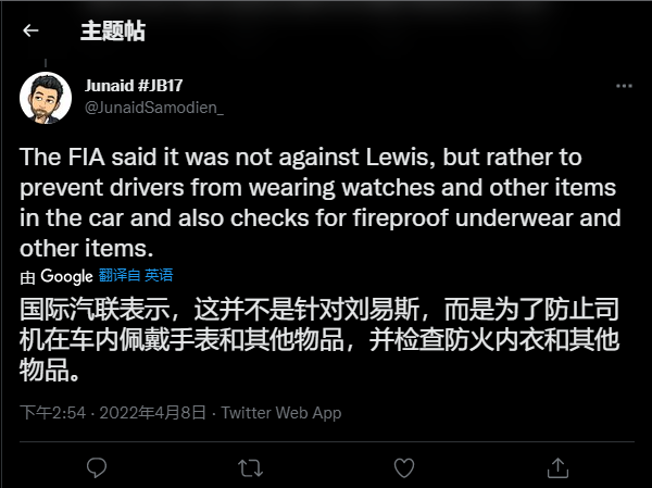 国际汽联表示,禁带首饰并不是针对汉密尔顿,而是防止车手在防比赛中佩戴手表等,以及会检查车手的防火内衣等。