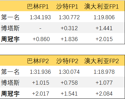 对比周冠宇巴林站、沙特站、澳大利亚站FP1、FP2成绩,除巴林站FP1外,周冠宇均落后第一名2s左右,落后队友博塔斯1s左右。