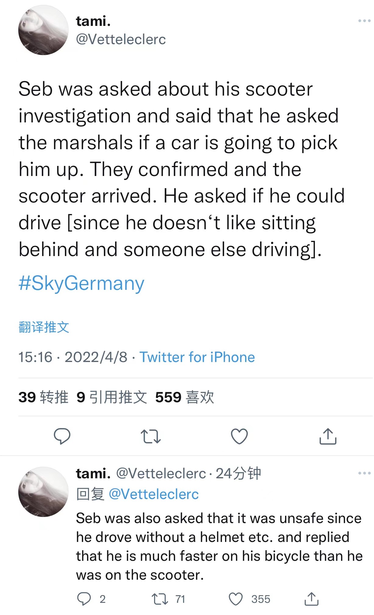 维特尔在采访时谈到了他骑摩托车的原因:他当时问马修是否有车来接他,他们表示会有车来,当他看到是摩托车时,他问马修是否可以让他自己骑,因为他不喜欢坐在别人的后排。