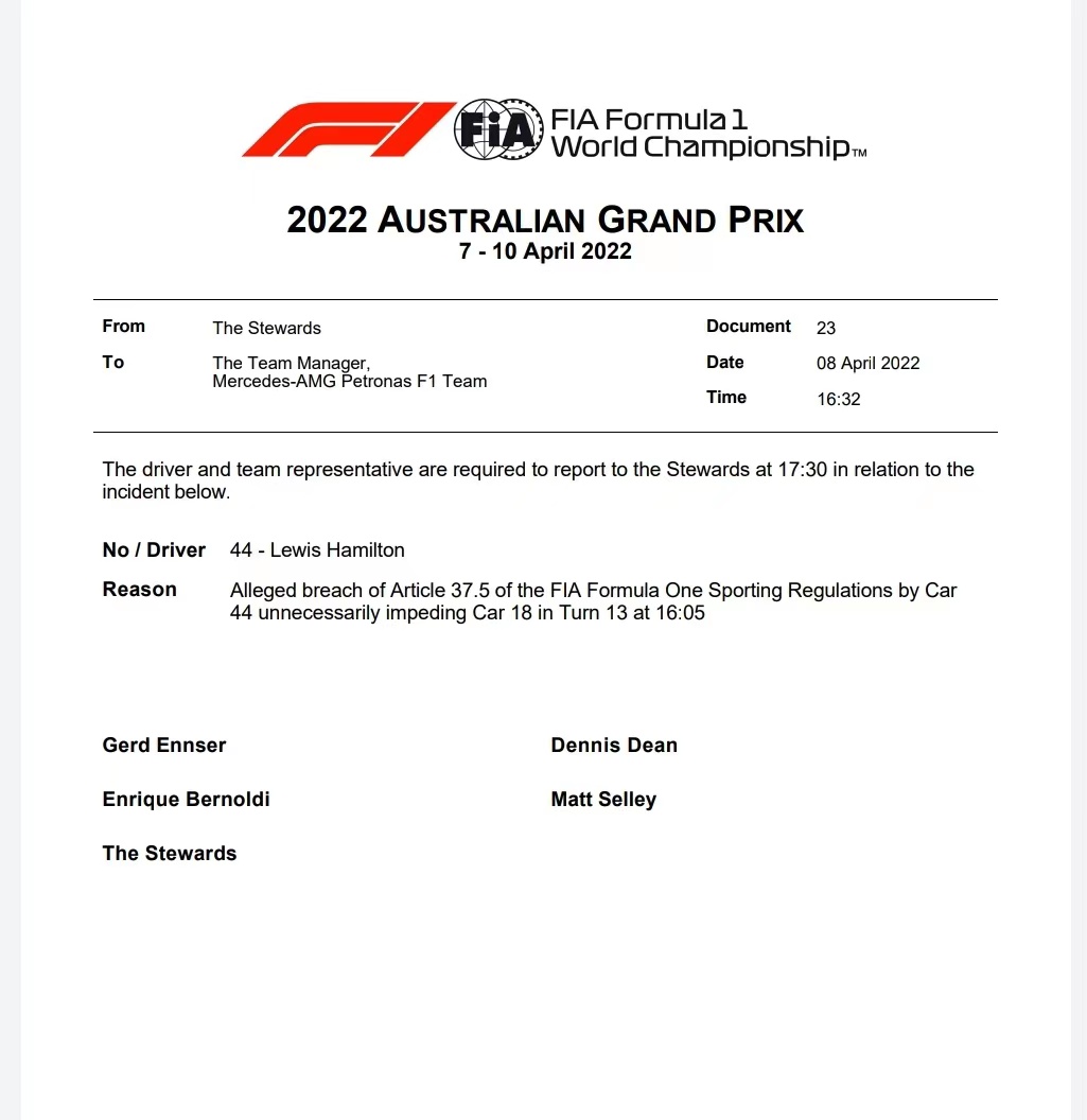 根据FIA文件,汉密尔顿因为在不必要情况下阻挡斯托尔,被赛会干事传唤。