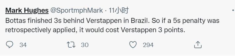 英国天空体育专栏作家马克·休斯(Mark Hughes)发贴称,如果维斯塔潘被罚时5秒,那他在巴西站的成绩将会下滑至第三,因为博塔斯仅落后他3秒。而这将使得维斯塔潘减少3个积分,从而在车手积分榜上的优势缩小为11分。
