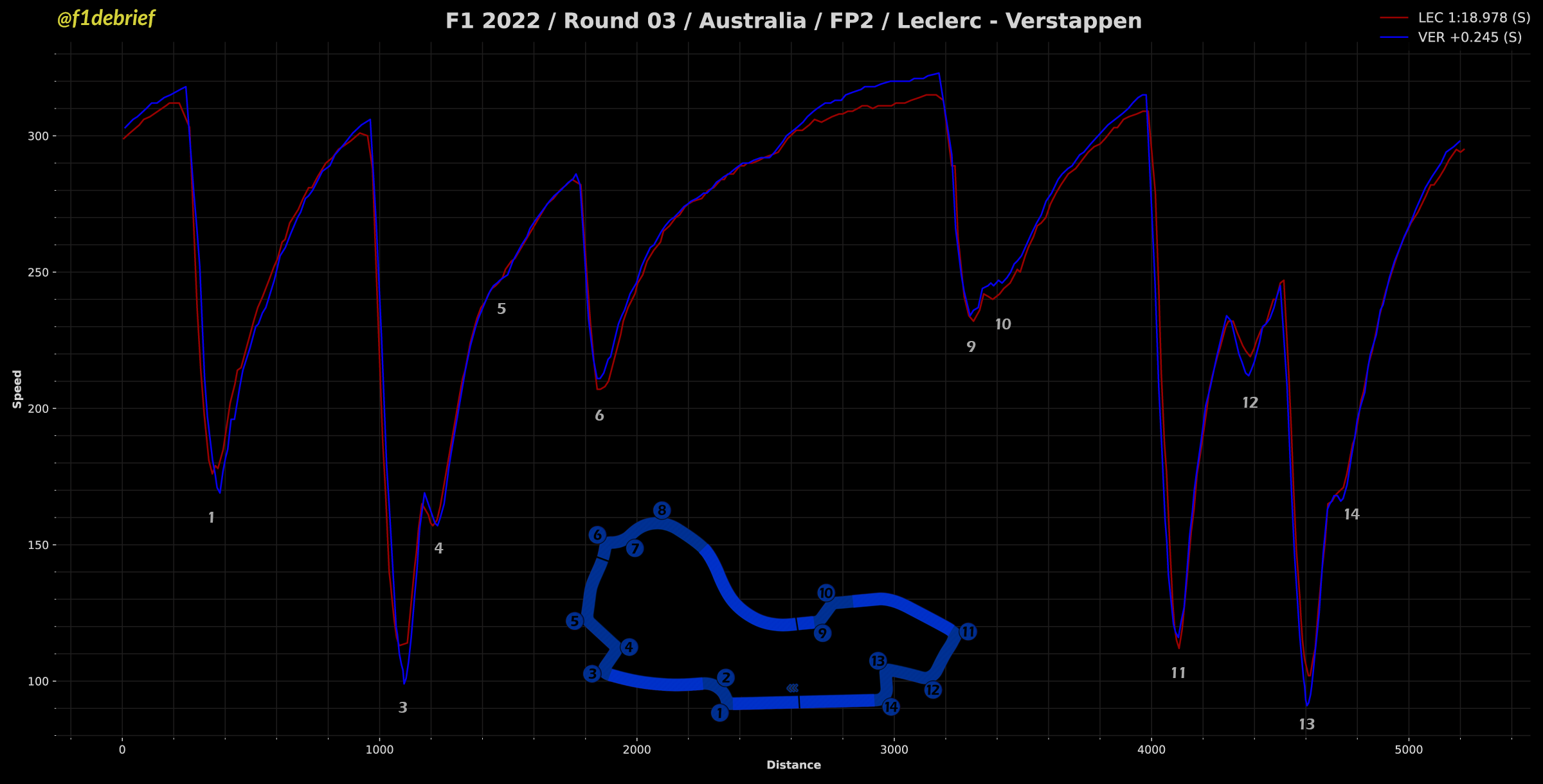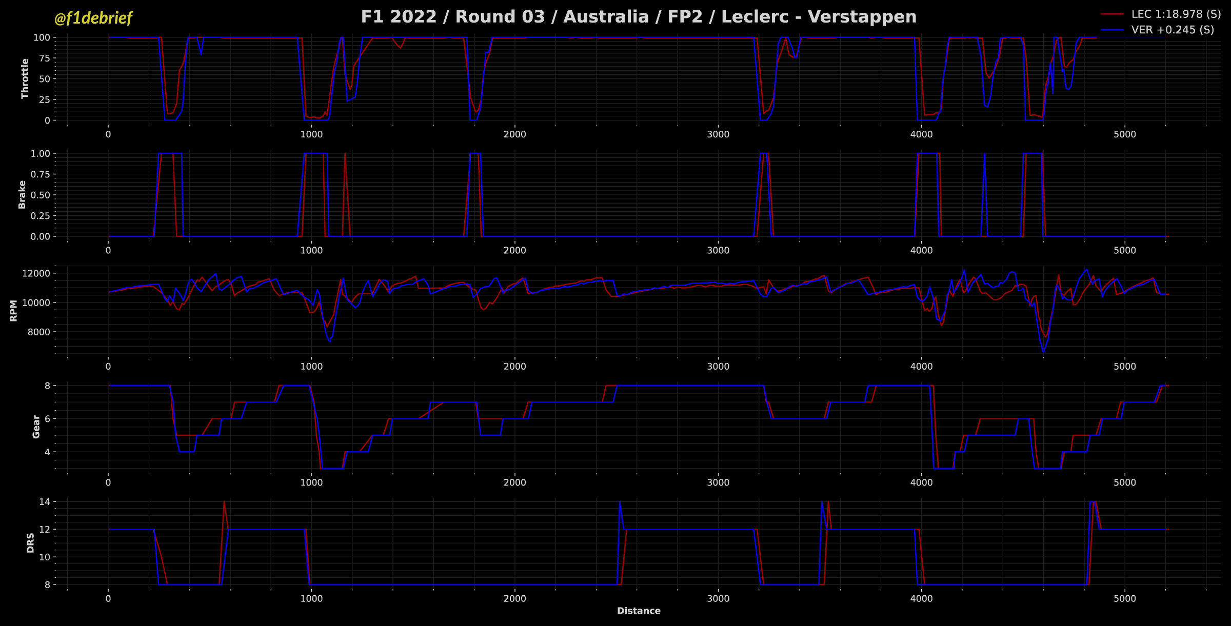 根据@F1 Debrief发布的F1澳大利亚站二练遥测数据对比,我们可以初步得到哪些结论?